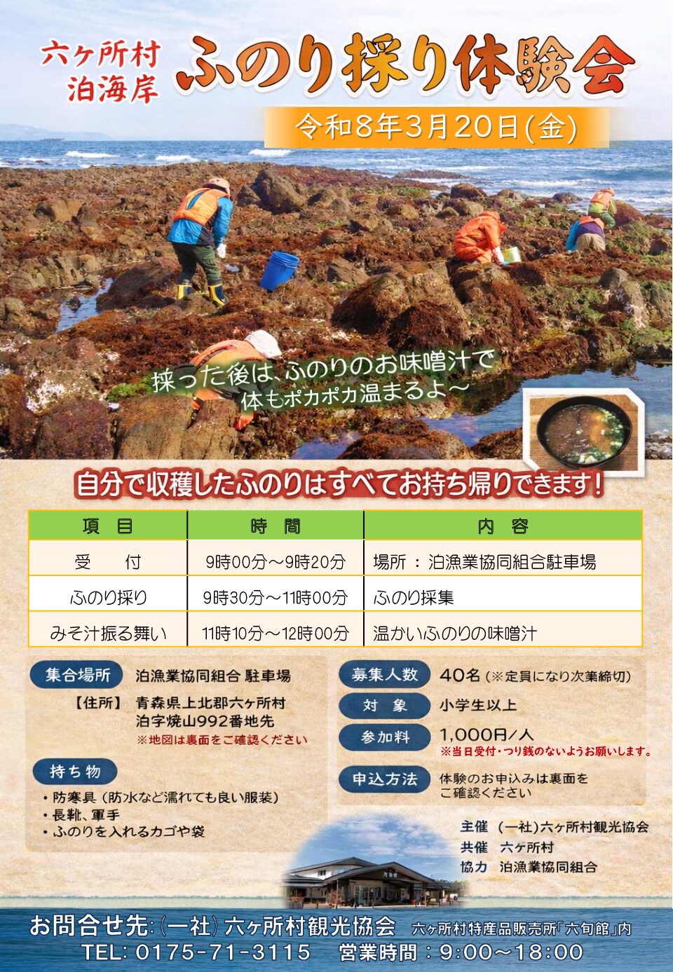 恒例となりました冬の風物詩「ふのり採り体験会」を今年も開催します。 泊海岸で、この時期にしか採れない貴重な海藻「ふのり」を実際に手摘み...